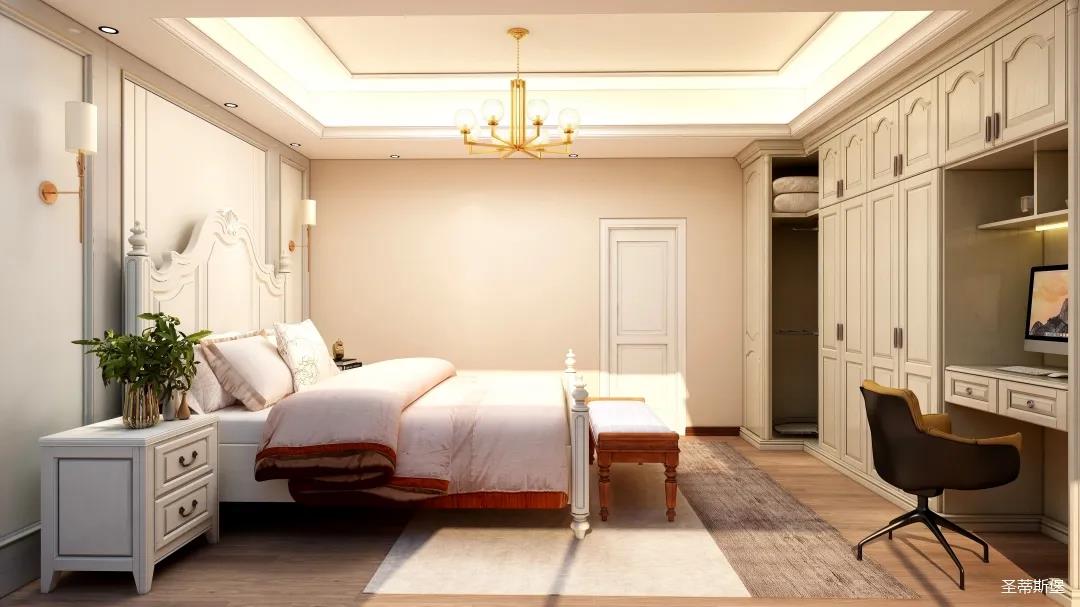 次臥的設(shè)計(jì)更注重收納,人性化嵌入式書(shū)桌,整排衣柜設(shè)計(jì)有效的利用了空間每一個(gè)角落。床屏在保持原有美式家具特色的同時(shí),增加了線條美,將繁雜的雕琢簡(jiǎn)化,并融入時(shí)尚的美式元素,壁燈,吊燈糅合自然光影,完美呈現(xiàn)出尊貴的空間格調(diào)。