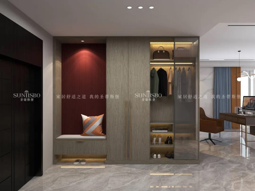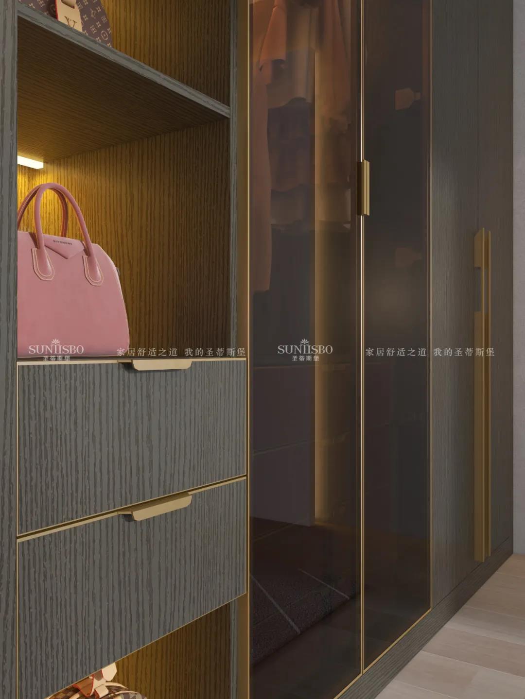 衣柜采用一體化的定制形式,木紋配合開放式玻璃柜門,從懸掛區(qū)收納、抽屜收納到鞋子收納等,均滿足超大收納系統(tǒng),讓每一件衣物都有自己的歸宿,更為愛美的你量身打造可觀賞的儲物空間。
