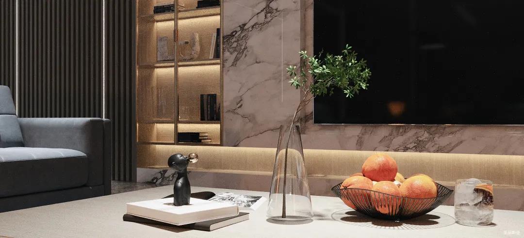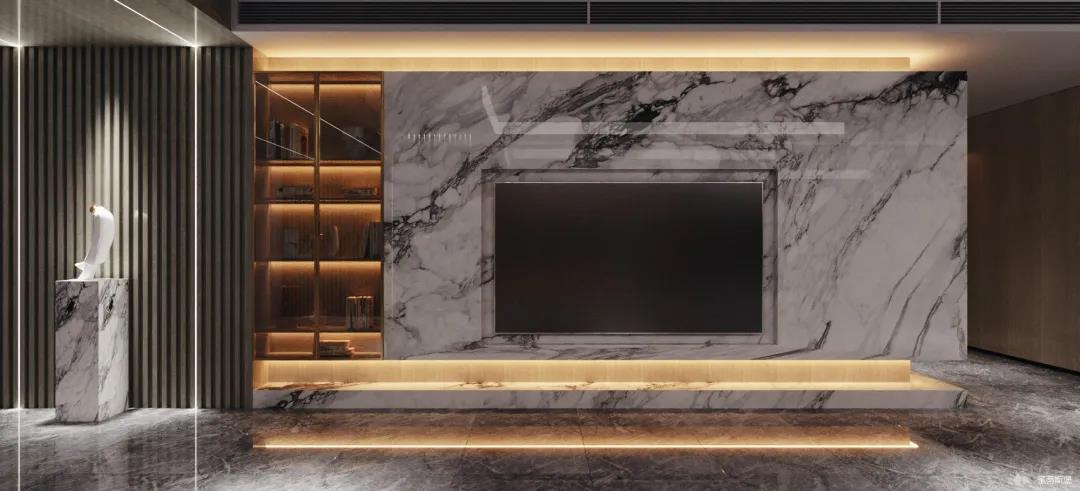 為了減輕現(xiàn)代都市工作的忙碌,客廳設(shè)計(jì)更偏向于對(duì)生活“解壓”的極簡,精選自然紋理的大理石與實(shí)木定制柜做一體化設(shè)計(jì),并在電視背景墻下半部分做挑空設(shè)計(jì),安裝個(gè)性十足的線性燈帶,延伸客廳視覺深度。