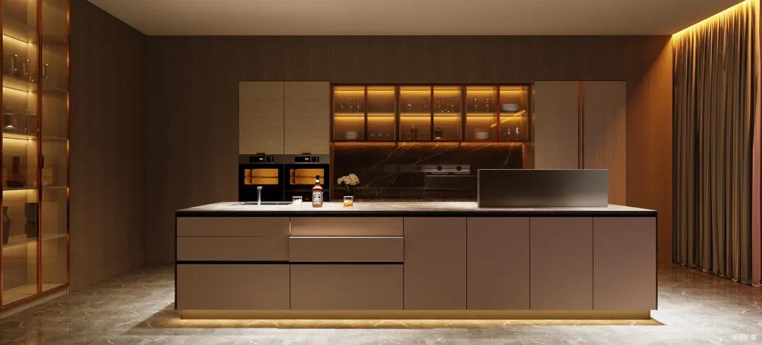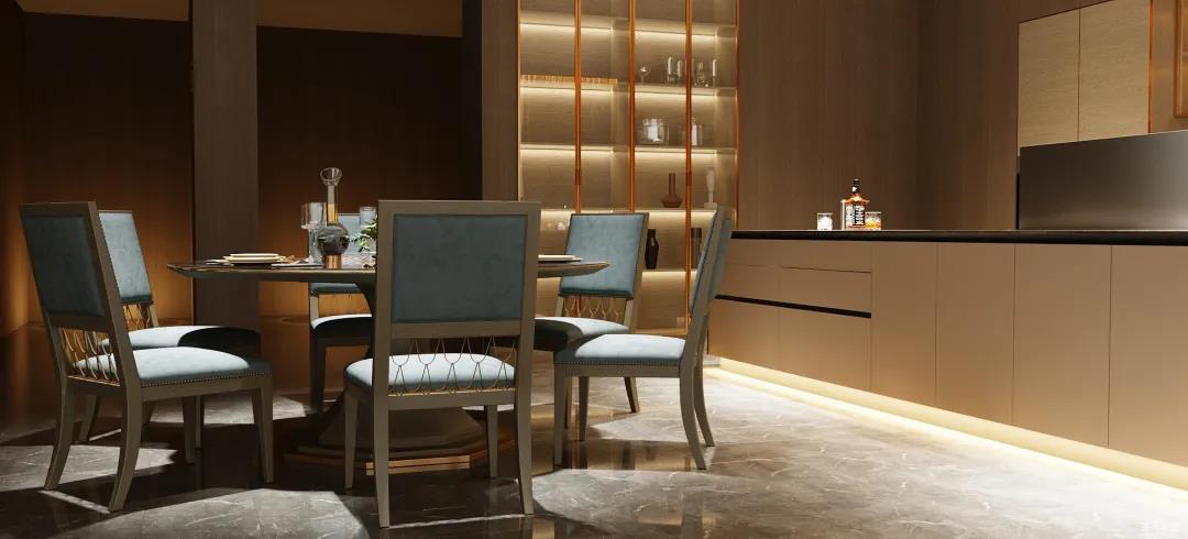 餐廚的極簡也可兼具多元,以一字內(nèi)嵌式展開的廚區(qū)收納柜,兼顧了從杯具、調(diào)料等廚用材料收納到廚電歸置動(dòng)線功能處理。在展示區(qū)域,玻璃隔板組合實(shí)木定制柜的表現(xiàn)形式,更是提升了空間的明亮度與寬闊感。