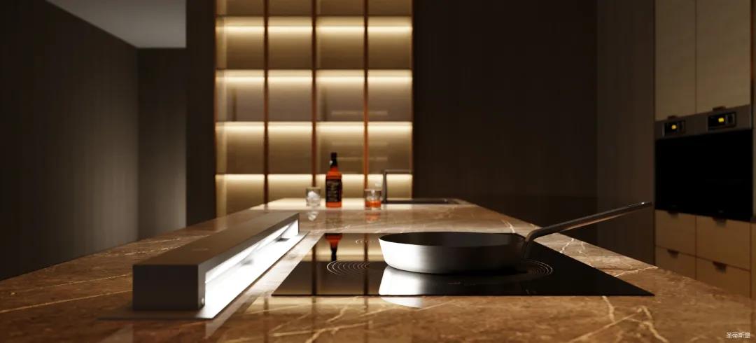 餐廳空間納入了多重材料,金屬、石材、木飾的搭配呼應(yīng)著飽和度較高的軟裝,將都市的舒適感與藝術(shù)氣息融為一體。極簡的單色線條美感在不同的材質(zhì)中形成明暗對(duì)比,開放式的包容空間格局實(shí)現(xiàn)了隱藏收納和陳列外漏的雙重功能。暖系的層板燈搭配著獨(dú)具特色的烹飪空間,營造出具有儀式感的用餐體驗(yàn)。
