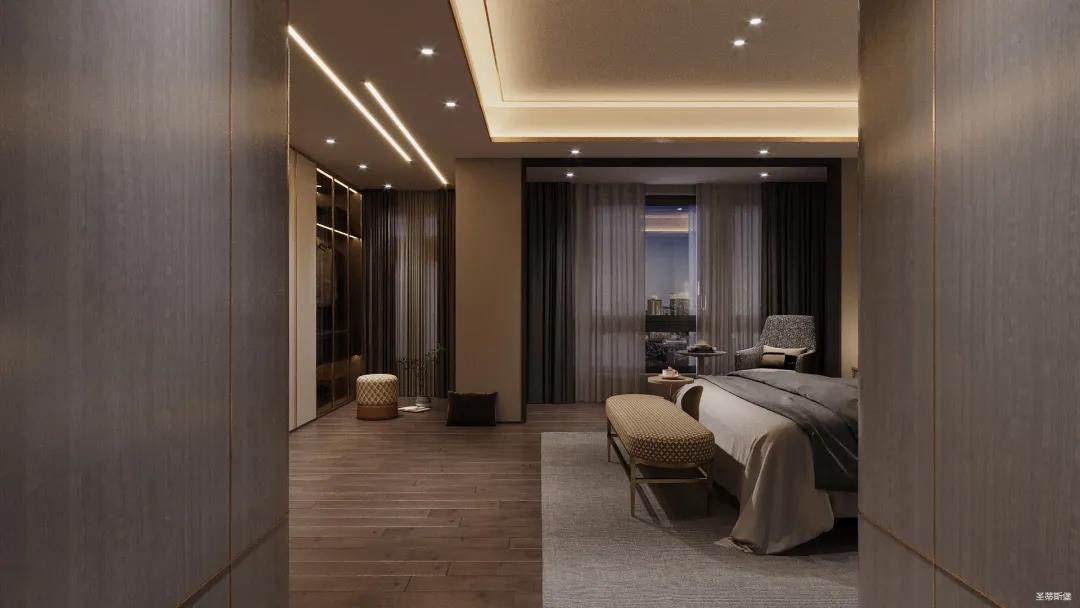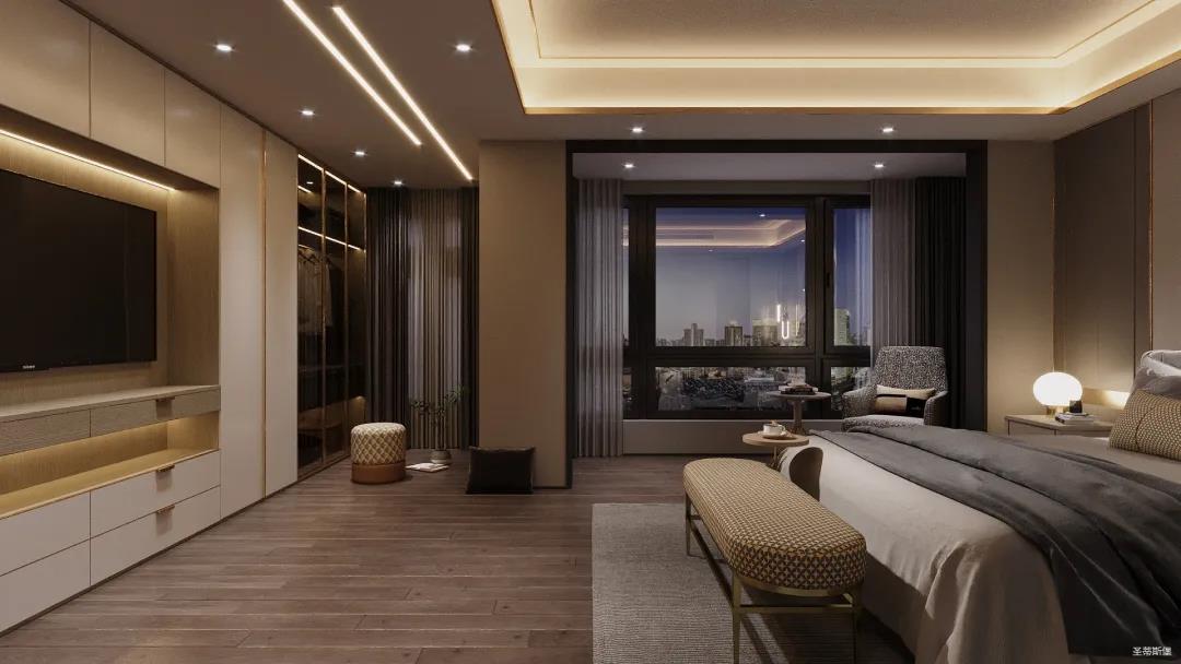 移步衣帽間,精簡華麗幾乎貫穿了整個(gè)空間,質(zhì)感高級(jí)的實(shí)木定制柜框架、通透明亮的玻璃展示區(qū)、色調(diào)醇厚的金屬鑲邊,每一項(xiàng)細(xì)節(jié)搭配都在強(qiáng)調(diào)著業(yè)主的高端品位。妝臺(tái)前的落地窗讓我們?cè)谟^賞都市繁華的同時(shí)也屏蔽了都市喧囂,讓我們置身于繁華都市中有一處寧靜休憩地。