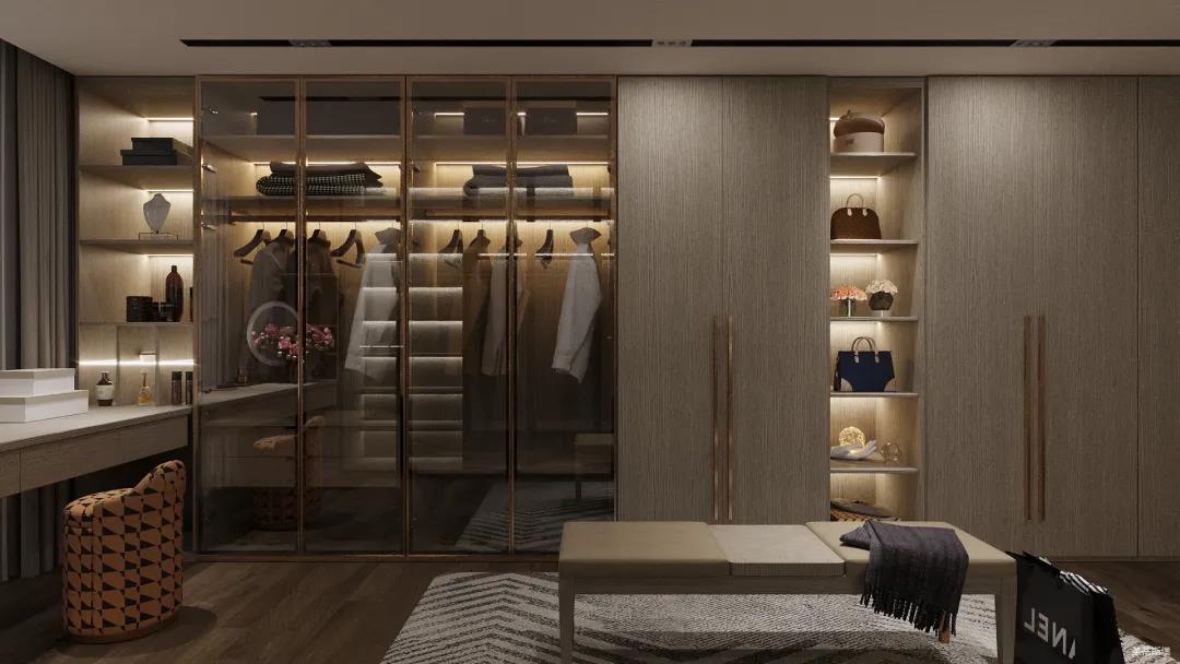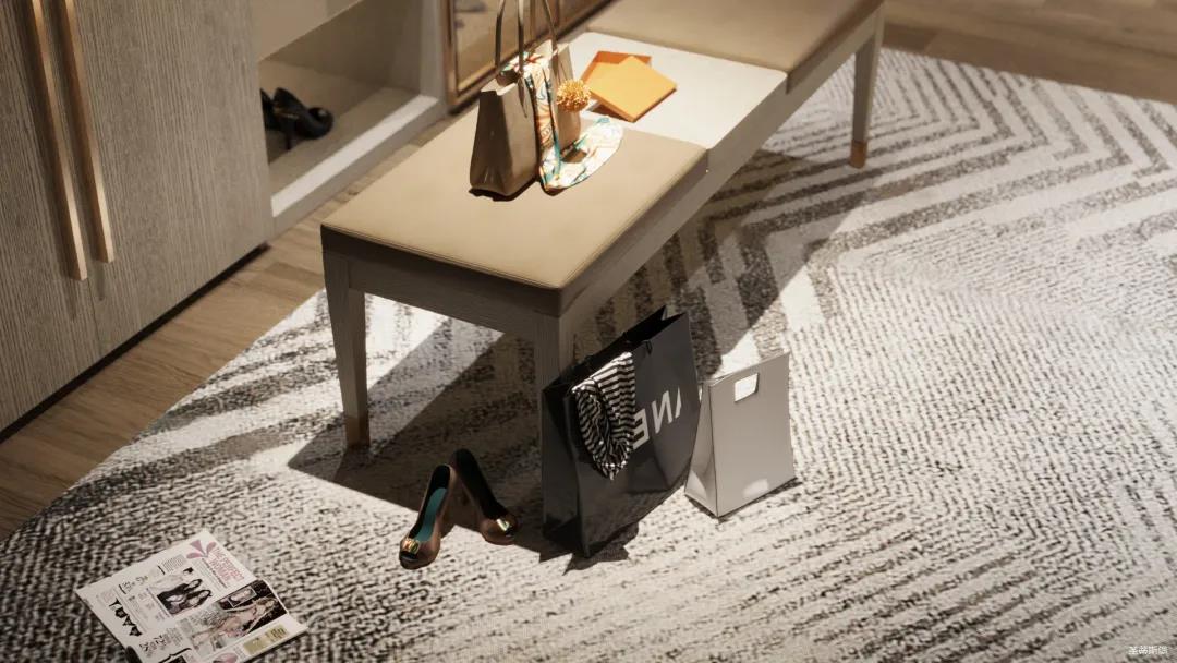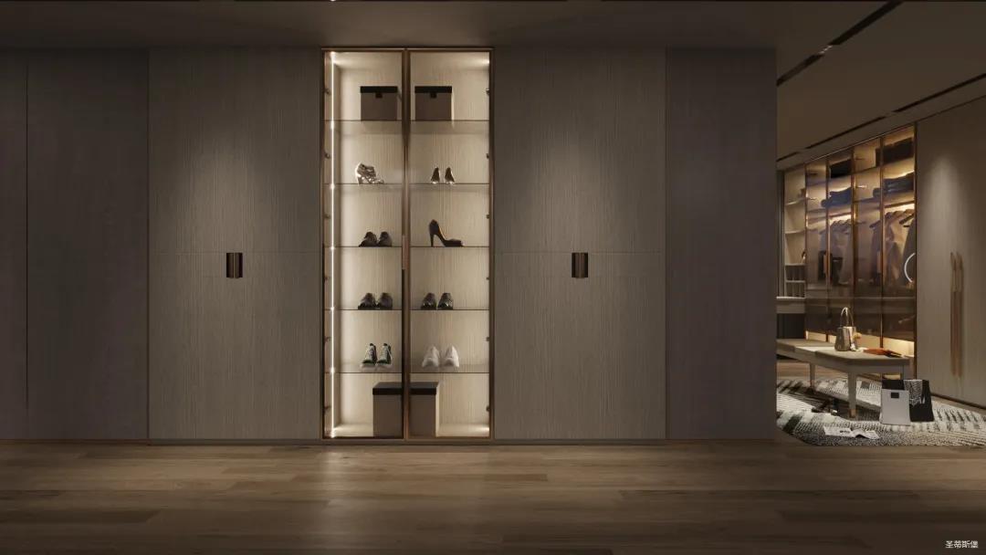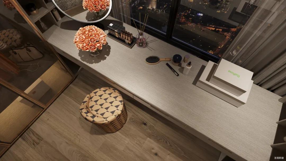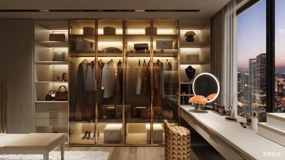 妝臺(tái)上隨心擺放的梳妝用品與櫥窗內(nèi)齊整的衣物收納形成鮮明對(duì)比,烘托出飽滿而真實(shí)的生活情境。人性化的合理分區(qū)收納也呈現(xiàn)了設(shè)計(jì)師在品質(zhì)與生活體驗(yàn)上的精細(xì)。