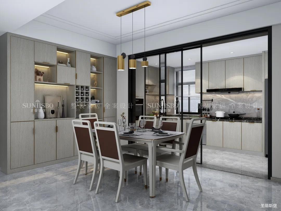 廚房餐邊柜的設計不遺余力的表達了收納充足藏而不漏,空間經過設計斟酌,將木元素作為空間主流,柜體上最能體現(xiàn)質感的歲月紋理,既是工藝升級的表現(xiàn),又是時尚的標志。