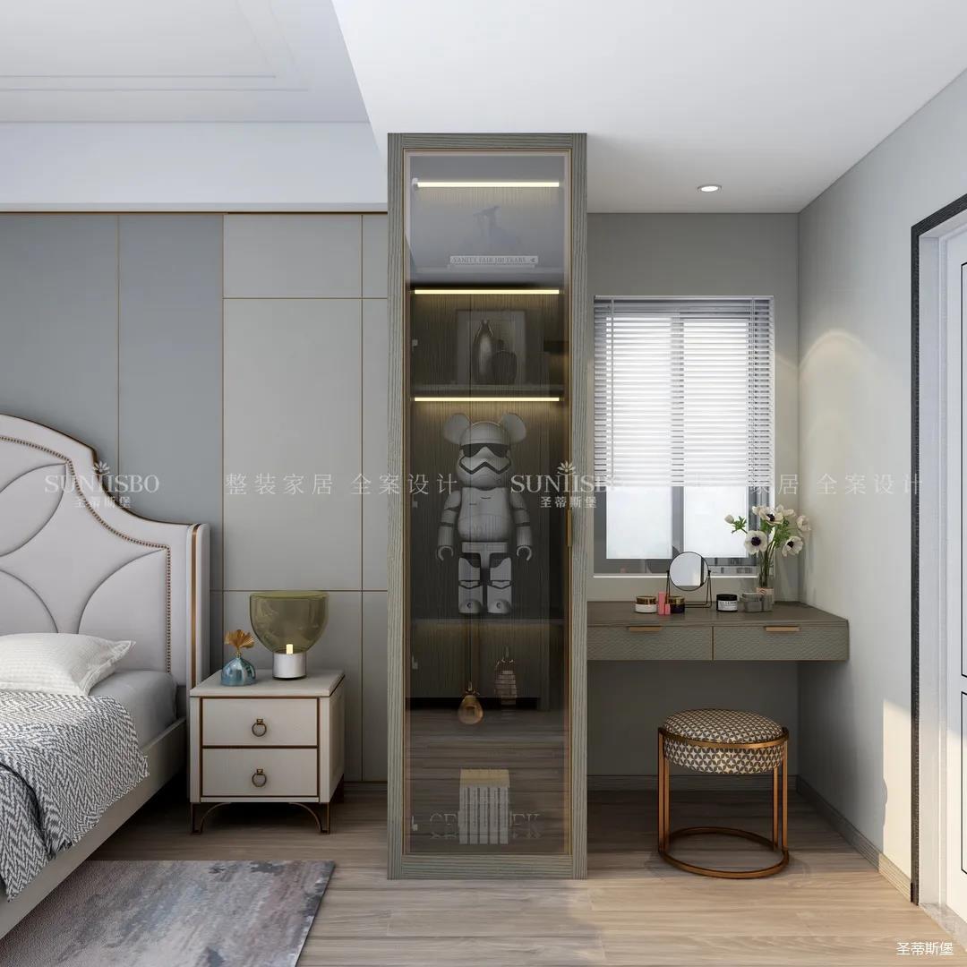 主臥的設計,整體風格與色調的一致,通過空間設計與軟裝細節(jié)的調控,顯得主臥多了一份寧靜與放松。四照花床屏的細節(jié)、材質色彩的把握、隔斷小書桌的設計,無不體現(xiàn)著設計師獨特的品位和全案設計的能力。