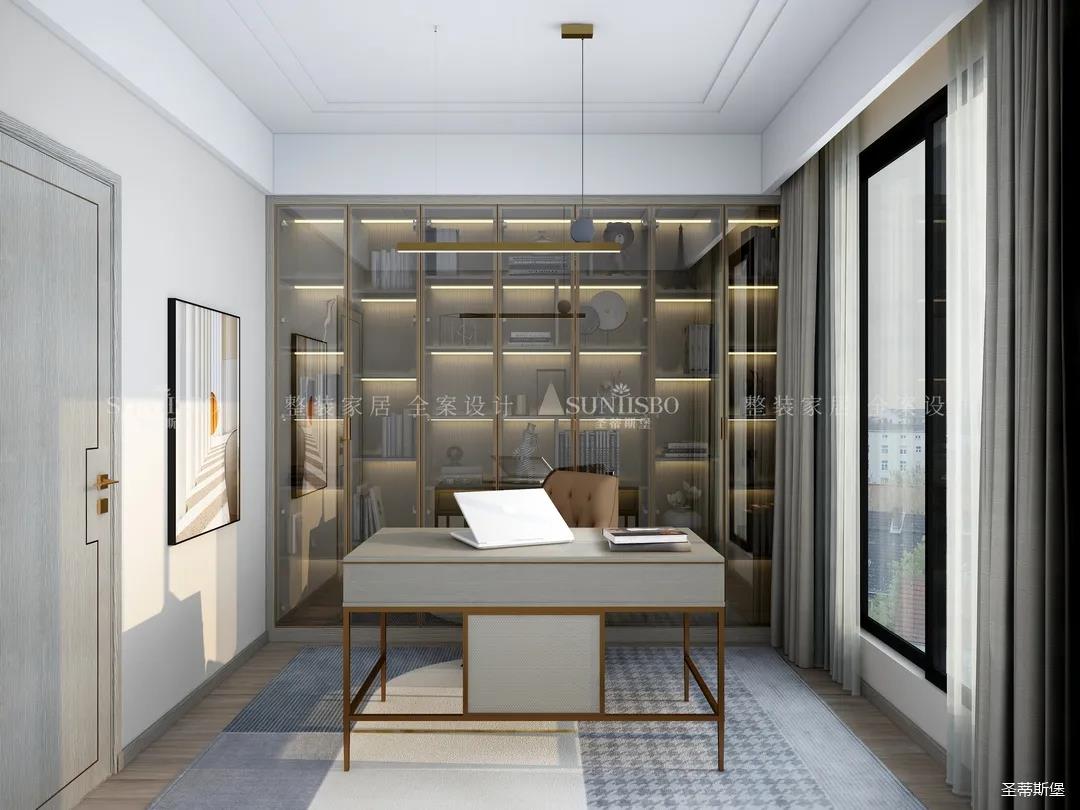 書房在陽光下襯得通透自然,半透明的灰玻利用高級且親和的色彩貫穿著柜體與空間的互動,溫潤的木質、輕奢的金屬以拼合的狀態(tài),將屋主感性與時尚的生活理念滲透進書房空間。不同材質的搭配為空間增添平衡感,使得緊繃的工作狀態(tài)得到放松。