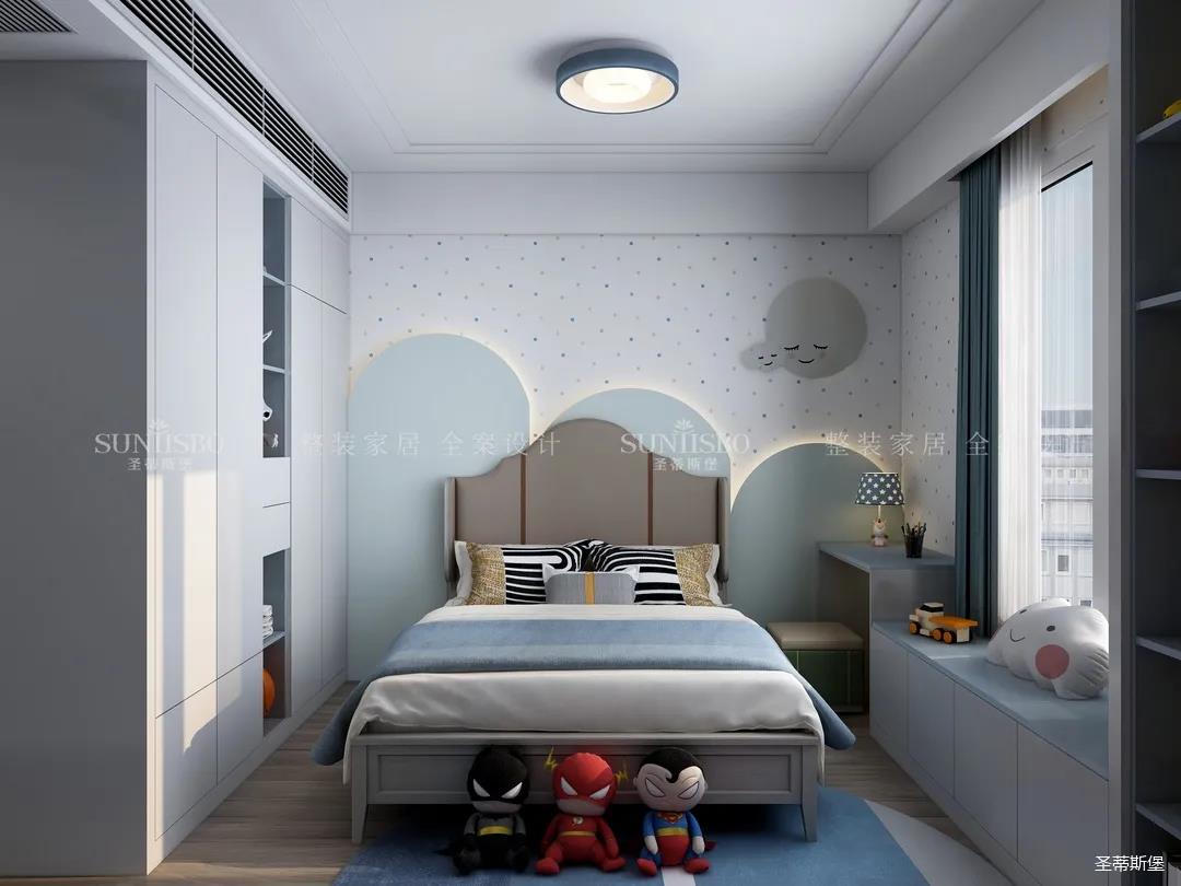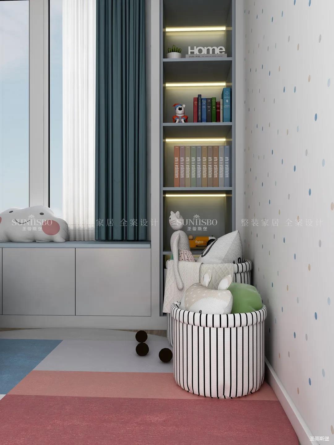 兒童房追求的是童真與自然,柜體的色彩與軟裝搭配完美呼應,云朵山峰的背景墻,以特立獨行的設計在視覺上讓心靈得到放空的意境。沿窗打造的飄窗格局,增加空間的功能性,造型簡約的柜體根據家裝理念摒棄了繁復的設計,更多展現(xiàn)的是空間自然之美。