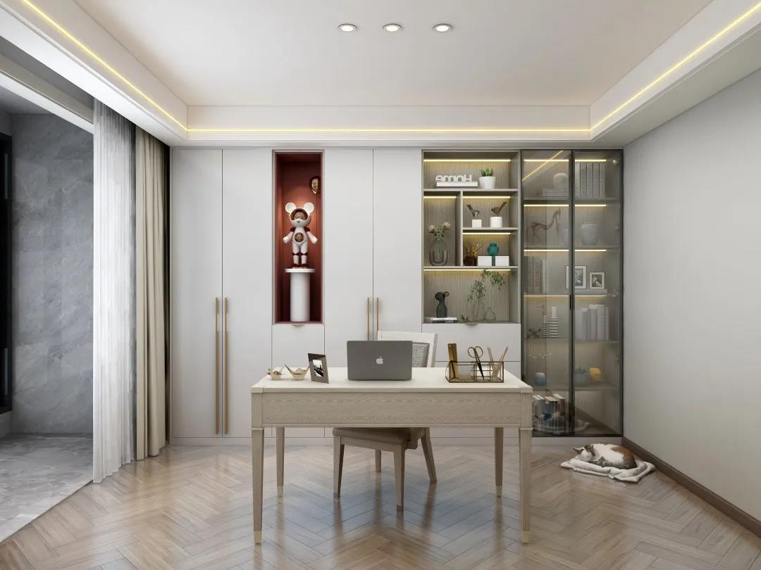 書柜以虛實結合的體塊感呈現(xiàn),疏密不一,相異的色調在橫縱間碰撞交錯,演繹靈動隨性之美,踱入書房,這一隅是閱讀、辦公最好的場所。
