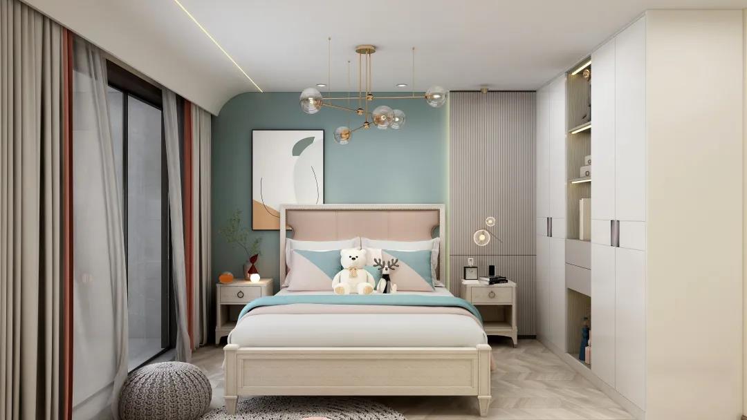 次臥淺灰色的背景墻時尚又內(nèi)斂,入目盡顯舒適的視覺感,為了避免過于單調,特意搭配了與整體保持一致的拼色窗簾,作為空間色彩的點綴。